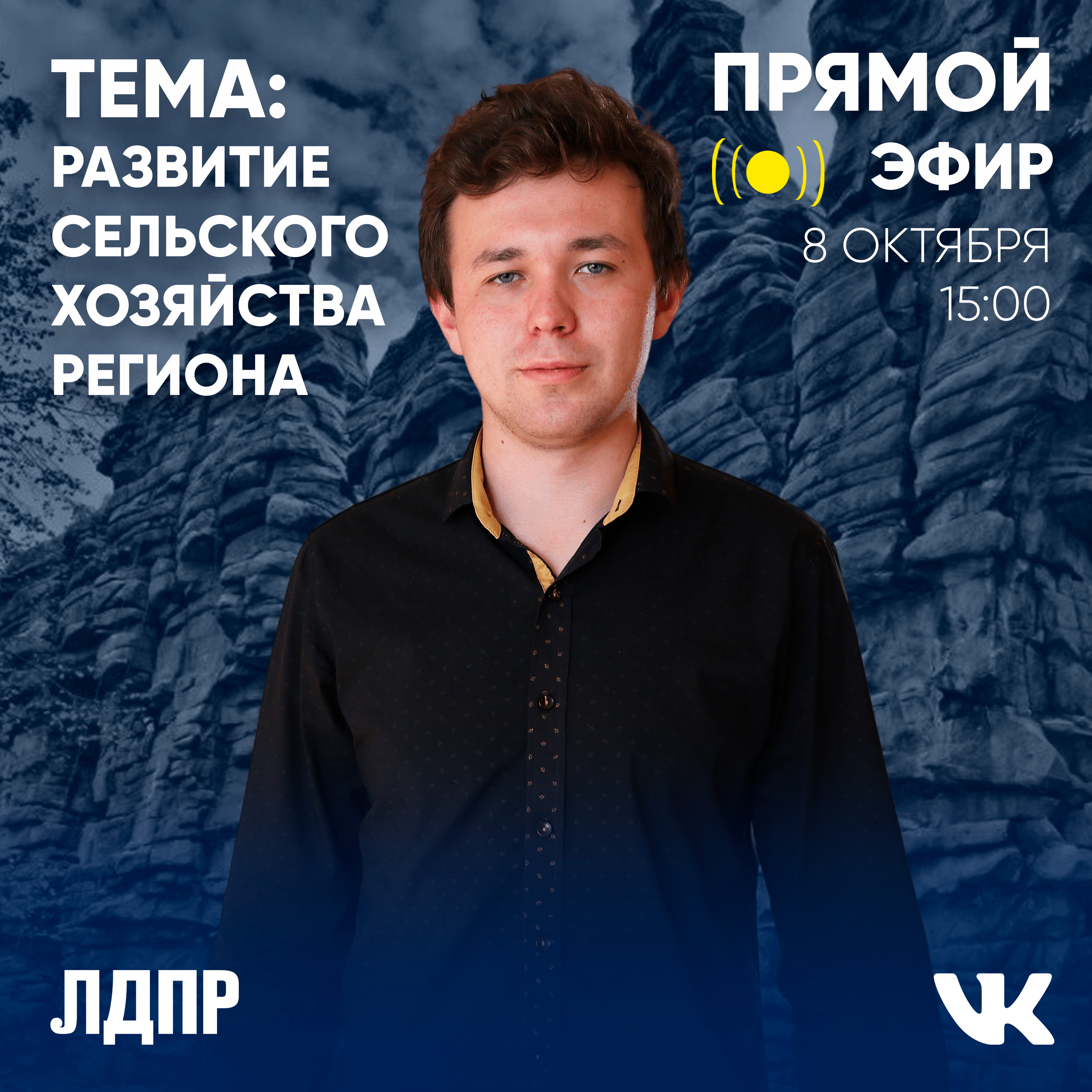 6 октября на онлайн-площадке Свердловского регионального отделения ЛДПР в VK состоится прямой эфир на тему: «День работника сельского хозяйства и перерабатывающей промышленности в России». Проведет эфир и ответит на ваши вопросы заместитель координатора Свердловского регионального отделения ЛДПР по молодежнойработе Максим Матерухин