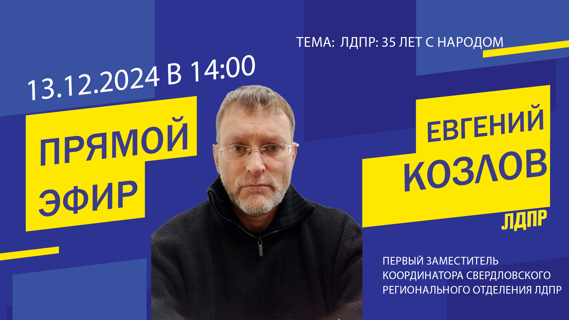 13 декабря в штабе Свердловского регионального отделения ЛДПР на онлайн-площадке VK состоится прямой эфир на тему: «ЛДПР:35 лет с народом». Проведет эфир и ответит на ваши вопросы первый заместитель координатора Свердловского регионального отделения ЛДПР Евгений Козлов