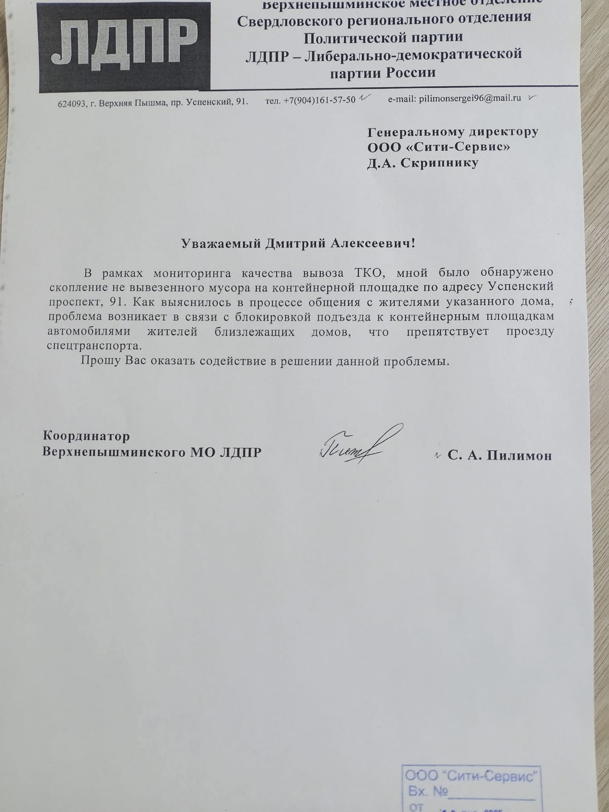 Кроме того, координатор Верхнепышминского местного отделения ЛДПР Сергей Пилимон подготовил обращение к организации «Сити-Сервис» с целью привлечь внимание к проблеме и инициировать действия по её решению. Партийцы взяли ситуацию на контроль, чтобы вернуть порядок на улицы Верхней Пышмы.