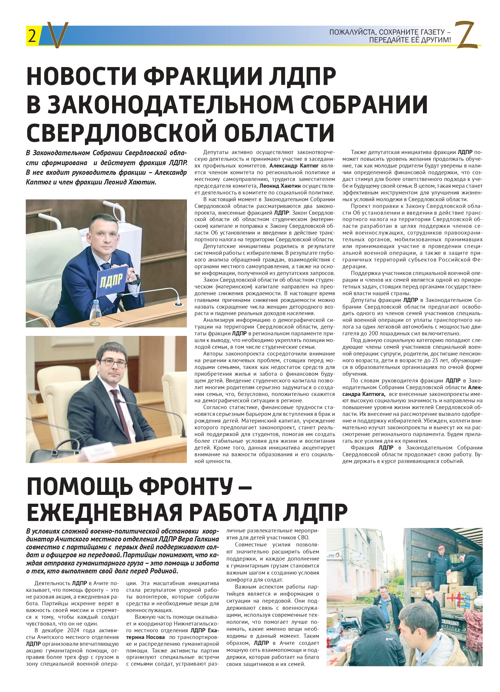 Особое внимание в газете уделено вкладу ЛДПР в поддержку бойцов, участвующих в СВО, с конкретными примерами помощи, оказанной депутатами в Малышевском городском округе.